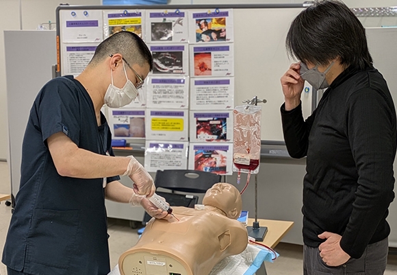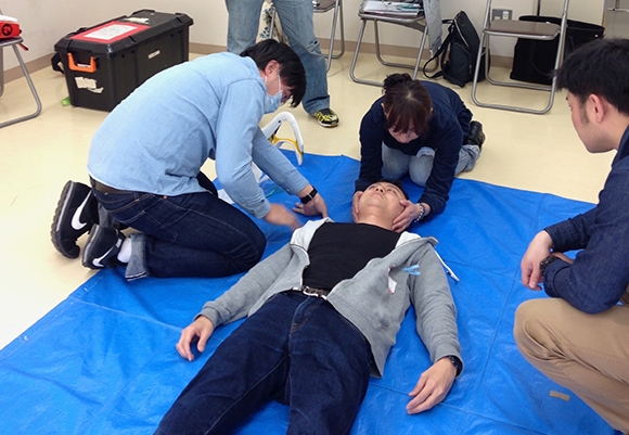 受講者は少人数のグループに分かれて実際に即したシミュレーション実習を繰り返し、約1日をかけて蘇生のために必要な技術や蘇生現場でのチーム医療を身につけます。