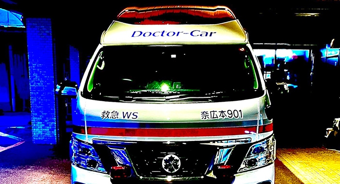ドクターカーで使用する車体は奈良県広域消防組合で運用している救急車であり、当院に常駐しています。近隣の消防署から救急車が当院へ医師と看護師をピックアップする形式ではないため、要請から出動までの平均時間は3.7分であり、速やかな出動が可能です。