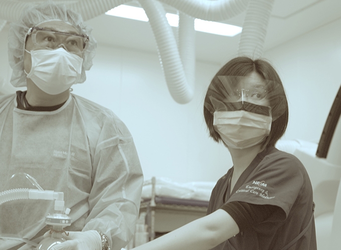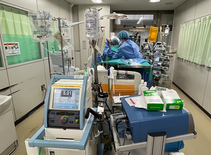 初期対応を⾏う“最前線に⽴つ「救急医」”は外来処置室から引き続き集中治療室で⼈⼯呼吸器や循環作動薬などを⽤いて診療を継続します。